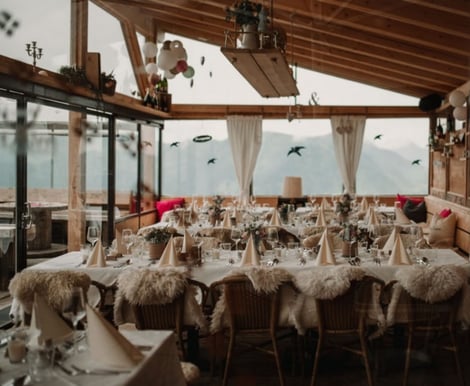 Die SchüttAlm besticht durch ihr uriges, liebevoll gestaltetes Ambiente. Das Highlight für Ihre Hochzeit ist die große Panoramaterrasse, auf der Sie und Ihre Gäste nicht nur kulinarische Köstlichkeiten genießen, sondern auch den spektakulären Blick auf die umliegenden Berge. Für den Empfang und entspannte Momente steht eine gemütliche Almlounge bereit. Die Location bietet Platz für bis zu 95 Personen – ideal für eine intime und dennoch großzügige Feier. Auf Wunsch kann auch ein Trauungszelt arrangiert werden, damit Sie Ihre Zeremonie unter freiem Himmel feiern können.