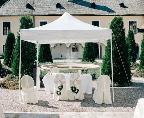 - Innenhof: Der charmante Innenhof, umgeben von der Schlossanlage und mit einem eleganten Springbrunnen, ist perfekt für den Empfang oder sogar Ihre Trauungszeremonie. Beheizbare und beleuchtbare Markisen auf 85 m² schützen Sie vor Sonne oder leichtem Regen.