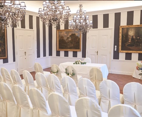 Sie können sich standesamtlich direkt auf Schloss Aumühle trauen lassen. Wählen Sie zwischen der romantischen Kulisse des Innenhofs oder dem eleganten Musikzimmer. Die ehemalige Schlosskapelle sorgt zusätzlich für ein historisch-feierliches Ambiente.