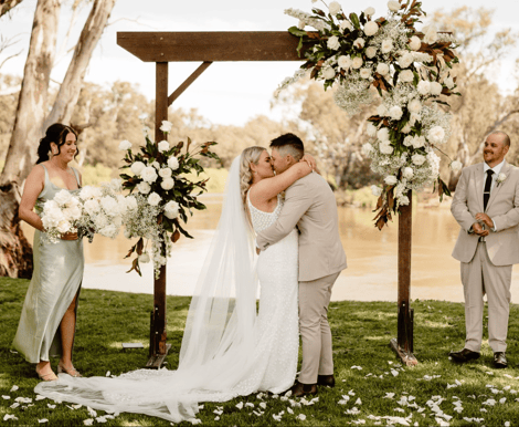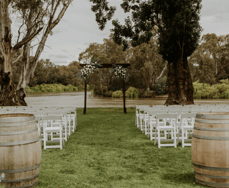 With Murray River frontage and a relaxed rustic-chic atmosphere, Perricoota Station is the perfect venue for couples looking for a down to earth Australian wedding. Natural elements are the heroes of this venue inside and out; the incomparable river views make the ideal ceremony backdrop, whilst the indoors showcases natural timber and native flora. Perricoota Station offers a variety of beautiful settings for your wedding ceremony. Whether you prefer the traditional elegance of the manicured lawns of the homestead or the stunning natural beauty of the riverside, we have the perfect spot for you. Our white folding chairs will create a beautiful aisle for you to walk down, and you can add your own personal touch with an arbour or other decorations. Let us help you create the perfect wedding ceremony for your special day. After your ceremony, your reception is just steps away at the historic Packing Shed. This spacious venue can comfortably seat up to 250 guests or have 350 standing, and is just metres from the waterfront. From the large deck, your guests will have stunning views of the Murray River and the surrounding Australian bushland, including iconic red gums. With its stunning riverfront location, rustic-chic atmosphere and abundance of natural beauty, Perricoota Station is a photographer’s dream come true. The rolling hills, historic buildings and meandering river provide endless possibilities for creative shots. From the intimate ceremony under a canopy of trees to the grand reception in the Packing Shed, every moment of your wedding day will be captured in stunning detail. So if you’re looking for a wedding venue that will take your breath away and make your photographer’s heart sing, Perricoota Station is the perfect choice for you.