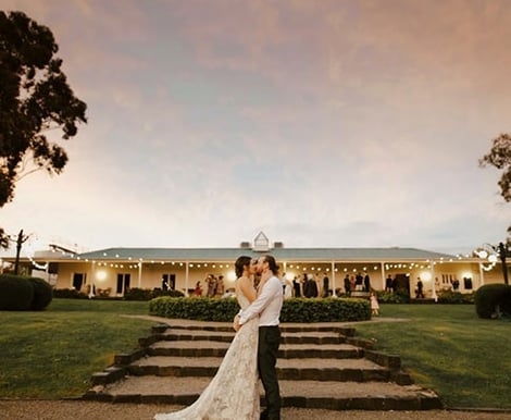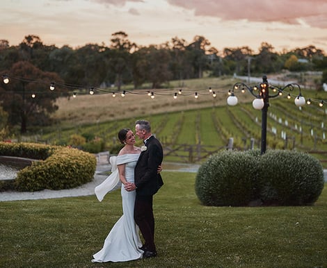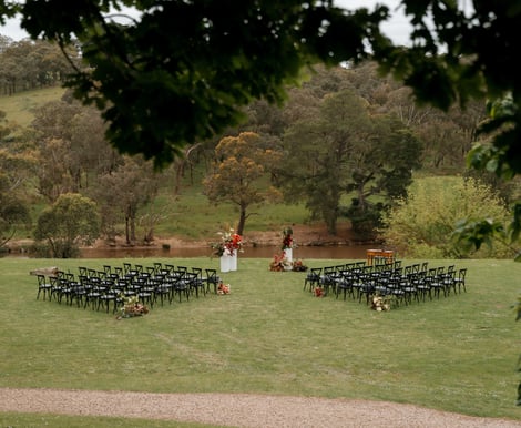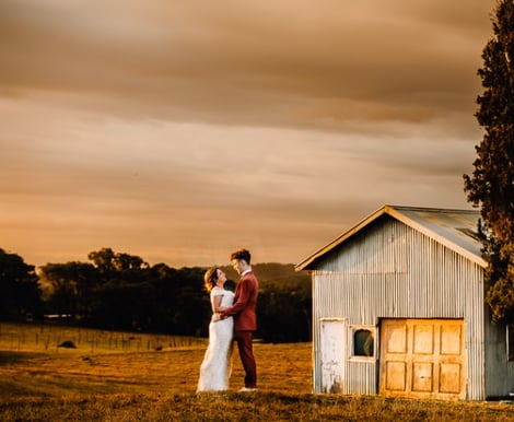 Our Sunset Spot is truly one of the most magical places for wedding photos. Just a short walk up a gentle hill, it opens onto a wide field with sweeping views of rolling hills, native trees, and a shimmering dam in the distance. An old farm shed with its vintage rolling door adds the perfect touch of rustic charm, making it an ideal backdrop for those groovy, mood-filled shots.