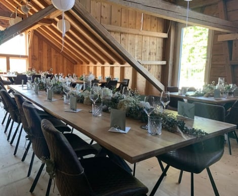 - Eventscheune: Die helle, klimatisierte Hauptscheune mit Galerie bietet Platz für bis zu 120 sitzende Gäste. Ausgestattet mit moderner Licht- und Tontechnik sowie Beamer, ist sie ideal für eure Zeremonie, das Dinner und die Party. Für Empfänge können bis zu 200 Gäste stehen.