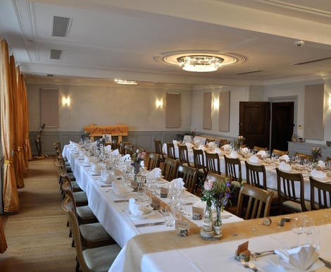 - Kreuz Saal: Unser größter Raum beeindruckt mit einer Stuckdecke, antikem Parkettboden und viel Tageslicht. Klimatisiert und stilvoll, bietet er Platz für bis zu 80 Gäste bei einem Bankett.