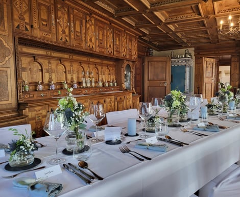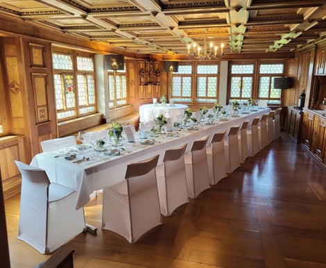 Die Location bietet exklusive, sorgfältig restaurierte Räume, die Platz für bis zu 35 Personen bieten – perfekt für eine Feier im engsten Kreis von Familie und Freunden. Highlights sind der prunkvolle Festsaal mit kunstvollen Stuckaturen und das historische Täferzimmer. Für Ihre Trauung steht die hauseigene Kapelle St. Antonius bereit, die Ihrer Zeremonie eine besonders feierliche Stimmung verleiht.