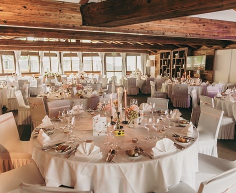Das Hotel Waldhuus überzeugt mit modernen, im Chalet-Stil gestalteten Räumen, die durch große Fensterfronten viel Tageslicht hereinlassen und direkten Zugang zur Terrasse bieten. Die kombinierbaren Säle „Sertig & Dischma“ bieten auf insgesamt 190 m² Platz für bis zu 120 Gäste und lassen sich flexibel an die Größe Ihrer Gesellschaft anpassen. Die warmen Holzelemente schaffen eine einladende Atmosphäre, die perfekt zu einer Hochzeitsfeier passt. Besonders praktisch: Für Hochzeitsfeiern entfällt die Raummiete, und Beamer sowie Leinwand stehen Ihnen kostenfrei zur Verfügung.
