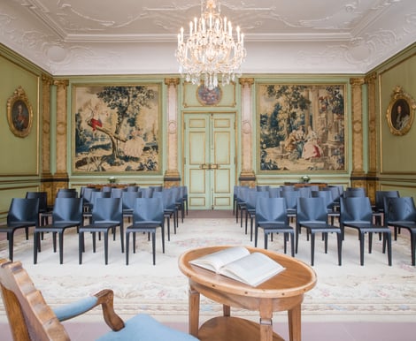 - Die Villa: Im Erdgeschoss erwarten Sie drei elegante, miteinander verbundene Räume: der Gartensaal sowie der Rote und der Grüne Salon. Mit ihren kunstvollen Stuckdecken und stilvollen Wanddekorationen schaffen sie ein festliches Ambiente. Der Gartensaal bietet Platz für bis zu 60 Gäste, kombiniert mit den Salons können Sie bis zu 114 Personen bewirten.