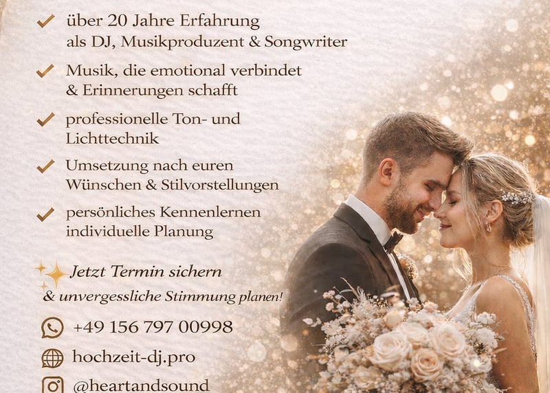 Die Musik eurer Hochzeit trägt maßgeblich zur Stimmung und Atmosphäre bei. Sie begleitet euch während des Einzugs und der Trauung, sorgt für Unterhaltung und bringt die Gäste auf die Tanzfläche. Bei Bridebook findet ihr eine Vielzahl an lokalen Profis, die den Abend nach euren Wünschen gestalten.