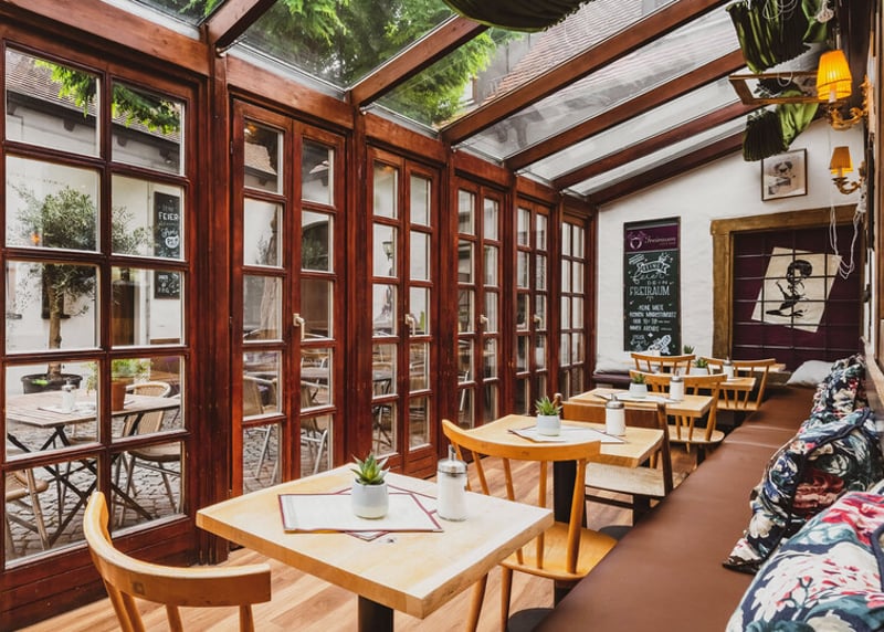 • Scheunencafé in der Nähe von Frankfurt: Die rustikale Scheune mit freiliegenden Holzbalken bietet Platz für bis zu 150 Gäste. Toll für den Sommer: Es gibt einen schönen Außenbereich für Zeremonien und Empfänge.