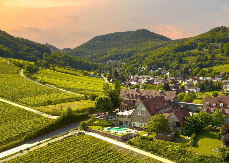 Weinzuhause in Mommenheim: Nicht nur für alle Weinliebhaber ist diese wunderschöne Location perfekt geeignet. Das Wein-Boutique-Hotel liegt mitten in den Weinbergen und bietet einen traumhaften Weitblick bis nach Frankfurt. Dazu gibt es ein Restaurant mit Terrasse und Gartenzugang, eine Vinothek und für eure Gäste 20 schöne Wohlfühlzimmer.