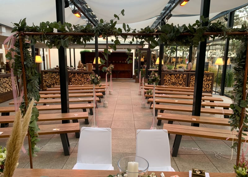 Kuhstall in der Nähe von Hamburg: Der umgebaute Kuhstall verfügt über ein geräumiges Interieur und bietet in gemütlicher Atmosphäre Platz für bis zu 120 Gäste. Auch hier gibt es einen schönen Garten für Zeremonien und Empfänge im Freien.