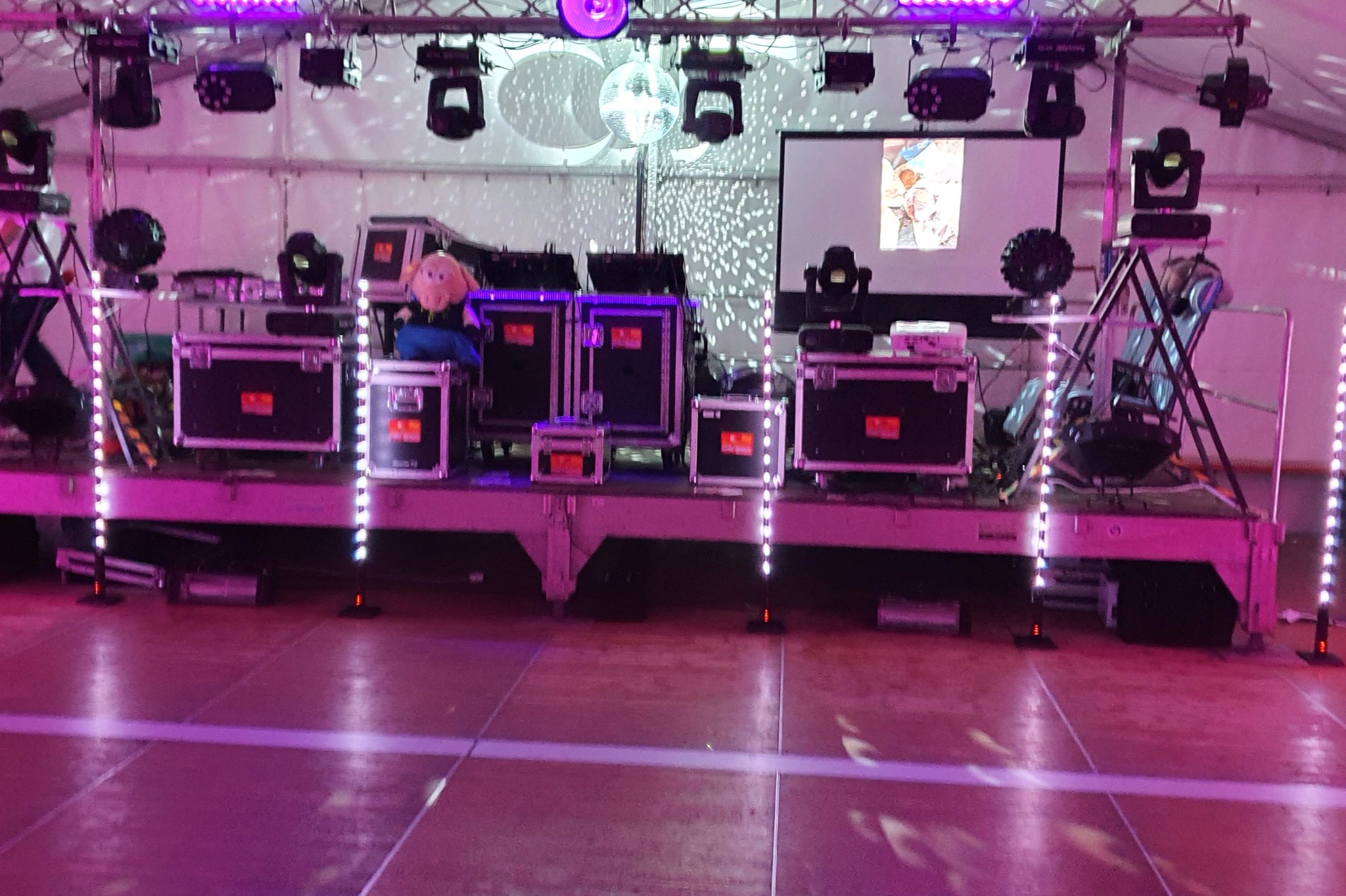 Ebenso Beamer und Leinwand, Lasershow, Nebelmaschine und ebenso Fotobox.