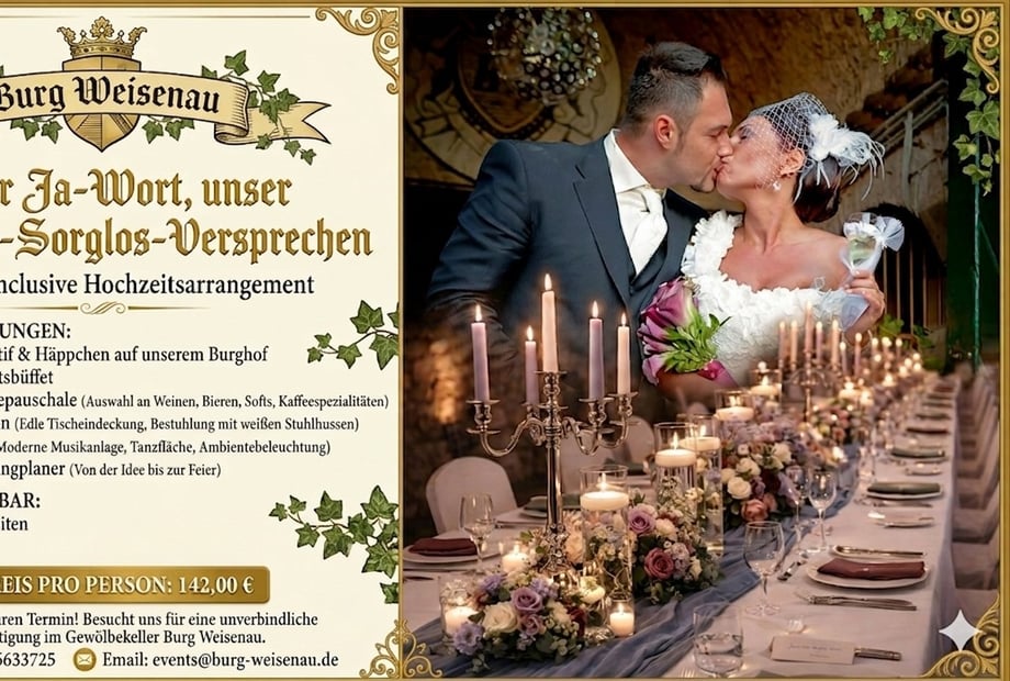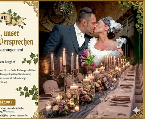 Exklusivität & Leidenschaft Auf Burg Weisenau feiern Sie exklusiv und ungestört. Von der edlen Tischeindeckung bis hin zur persönlichen Betreuung durch unser erfahrenes Team – wir setzen auf Qualität statt Quantität.