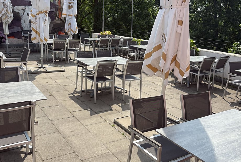 Wir haben eine schöne, große Terrasse, auf die man direkt über den Saal Zugang hat. Unser Hotel befindet sich in der Nähe vom Fischerviertel und ist somit in der Nähe der Donau.