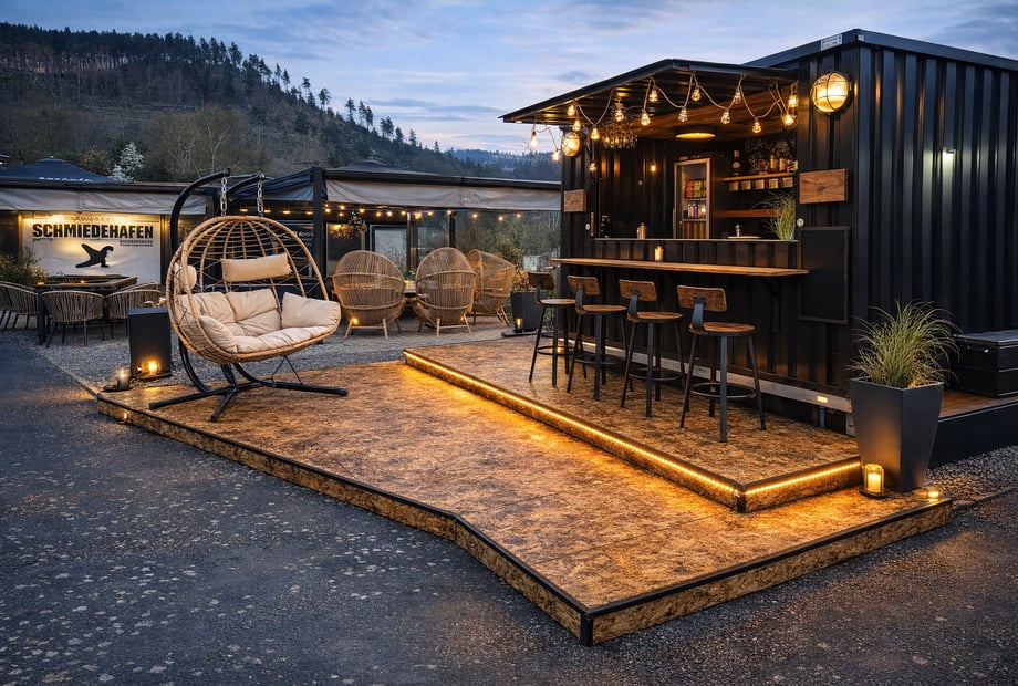 Für ein echtes Eventgefühl sorgt unsere Hafenbar – ein stilvoll ausgebauter Ausschankwagen mit Holzoptik, Zapfanlage und Beleuchtung. Sie wird gezielt als Bar- und Treffpunkt eingesetzt und schafft eine lockere, hochwertige Atmosphäre für Drinks, Gespräche und besondere Momente.