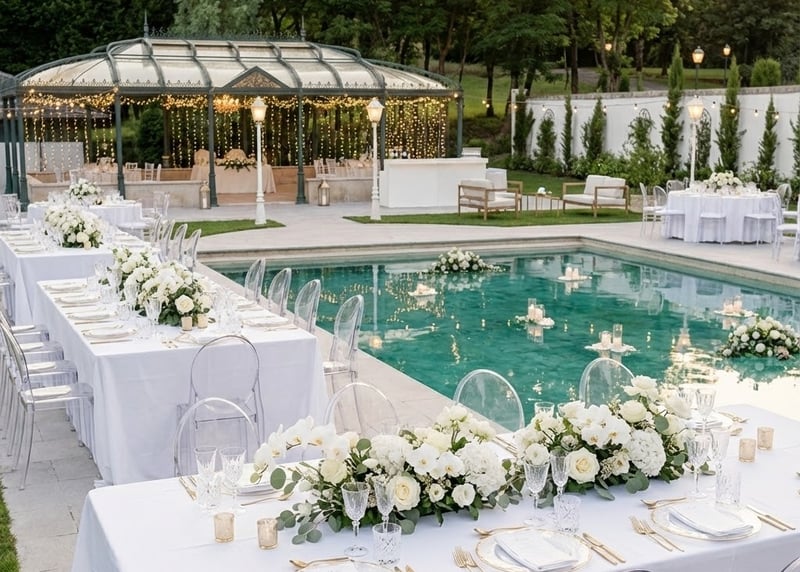 These services often include high-end catering, sophisticated floral design, live music or DJ, event coordination, professional photography and videography, and guest activities, such as wine tastings , tours of the property and excursions in the area.