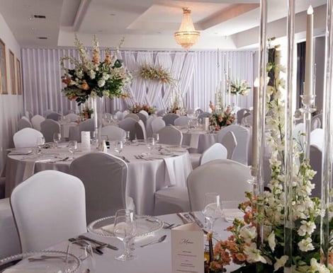 - Sala Bankietowa: Przestronna, elegancka sala o powierzchni 300 m², mieszcząca do 200 gości. Wystrój z efektownymi żyrandolami i świeżymi kwiatami tworzy idealne tło dla wesel w stylu glamour i bankietowym.