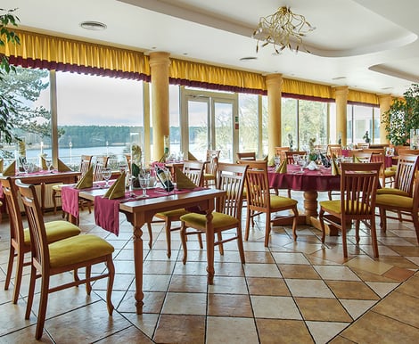 - Restauracja Nad Jeziorem & Sala Nad Potokiem: Połączone sale tworzą komfortową przestrzeń dla maksymalnie 150 osób. Restauracja z panoramicznym widokiem na jezioro to miejsce na serwowanie posiłków, a Sala Nad Potokiem zapewnia przestrzeń do tańca. Dodatkowo, wielopoziomowe tarasy pozwalają na relaks na świeżym powietrzu.