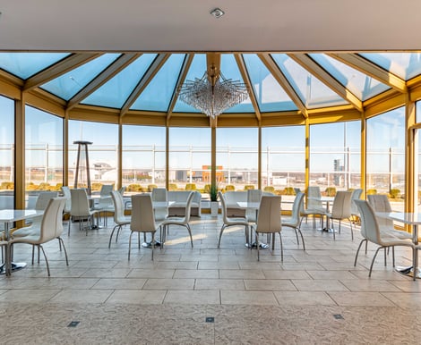 - Sala Kryształowa – imponująca, przeszklona przestrzeń na huczne wesela, mieszcząca od 270 do 300 gości. Elastyczny układ stołów pozwala na aranżację zarówno prostokątną, jak i okrągłą.