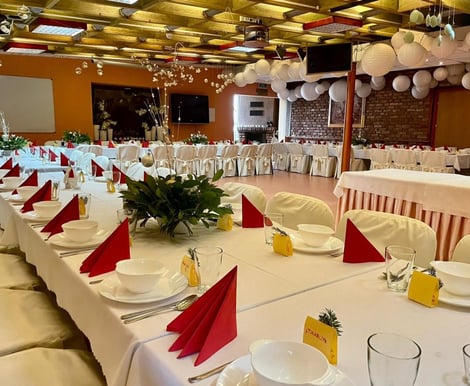 Ośrodek specjalizuje się w organizacji przyjęć weselnych, zapewniając kompleksową i profesjonalną obsługę na każdym etapie przygotowań. Do dyspozycji par młodych jest przestronna sala bankietowa, mieszcząca do 100 gości, co gwarantuje komfort i uroczystą atmosferę.