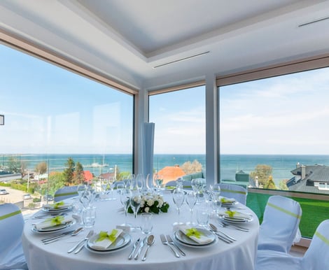 Przystań Mechelinki to butikowa lokalizacja, która specjalizuje się w organizacji przyjęć dla maksymalnie 35 gości. Dzięki temu Wasze wesele będzie kameralne i pełne swobody. Do dyspozycji macie elegancką salę z panoramicznym widokiem na morze oraz zewnętrzny taras ze szklaną balustradą – idealne tło do niezapomnianych chwil.