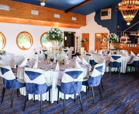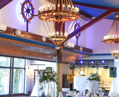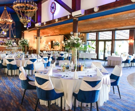 - Sala Restauracyjna: Klimatyzowana, główna sala z widokiem na jezioro pomieści do 140 osób. Jej marynistyczny wystrój z oknami w kształcie bulaj oraz stylowymi żyrandolami tworzy niepowtarzalną atmosferę. Drewniany parkiet i scena dla zespołu lub DJ-a zapewniają komfortową przestrzeń do tańca i zabawy.