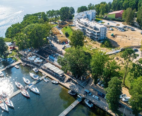 - Baza noclegowa: 28 stylowych, drewnianych apartamentów dla maksymalnie 94 osób. Każdy apartament wyposażony jest w aneks kuchenny i łazienkę, a z okien rozciąga się widok na jezioro lub marinę.