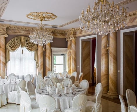 - Oranżeria w Parku: Nowoczesna, klimatyzowana sala o powierzchni 400 m² pomieści od 130 do 260 gości. To doskonałe miejsce dla większych wesel, z pięknym widokiem na zieleń otaczającego parku.