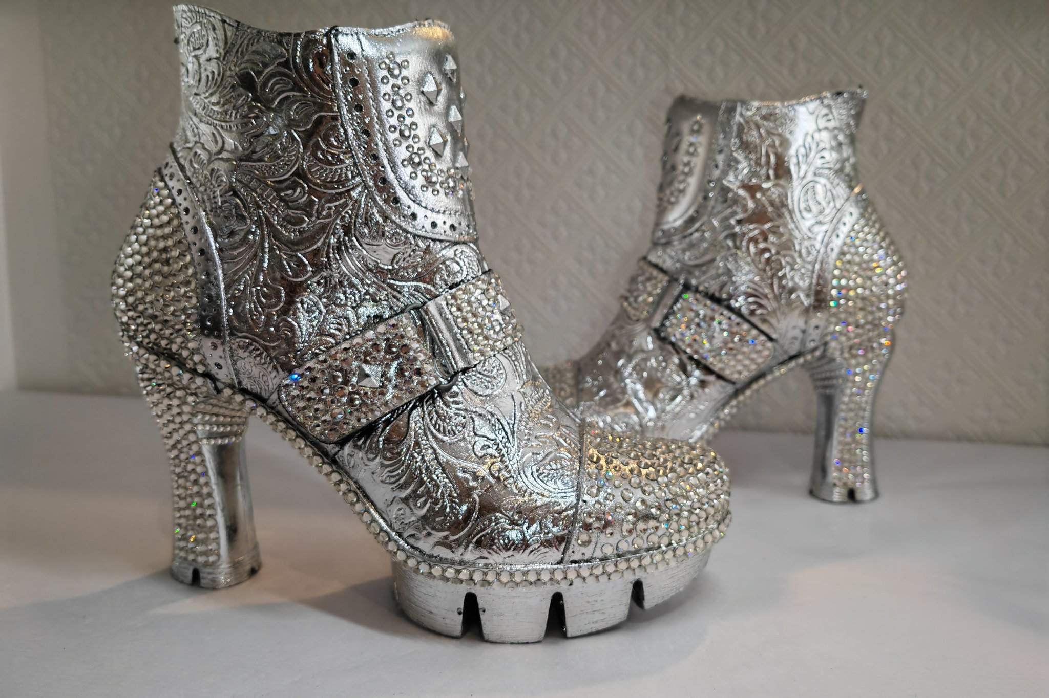My speciality is customising wedding shoes to tell the story of romance, personality and the bride's own unique style. To begin the process, the bride would firstly get in touch with me via email or phone and we have an informal discussion about her own ideas and thoughts on how she would like her wedding shoes to look. If she has arleady bought her shoes she can email me a picture of them. Seeing the shoes first also helps me generate some ideas too and we can discuss them together before any final design is decided upon. I accept orders worldwide so a lot of the consultation is done via email for the majority of my brides. However, if you would like to visit me I live in Lancashire, North Manchester, UK not far from Ramsbottom village, Bury. Your shoes would be with me for 4 weeks and your shoes would be returned to you by special delivery or courier with insurance cover included.