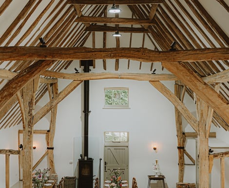 The Barn features a warm and inviting ambiance with cozy wood burners, blending historic character with modern comforts to create the perfect atmosphere for your celebration.