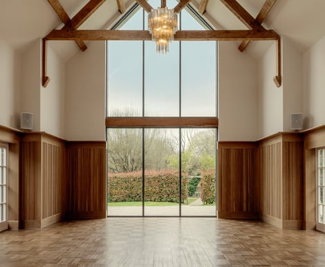 The venue features a stunning oak-beamed Ceremony Hall with high, vaulted ceilings and expansive windows, filling the space with natural light and providing an elegant yet modern take on a classic barn setting. Couples can also choose an outdoor ceremony in the walled garden under a charming oak Arbour. Licensed for weddings from April to September, this scenic spot offers a picturesque backdrop for exchanging vows.